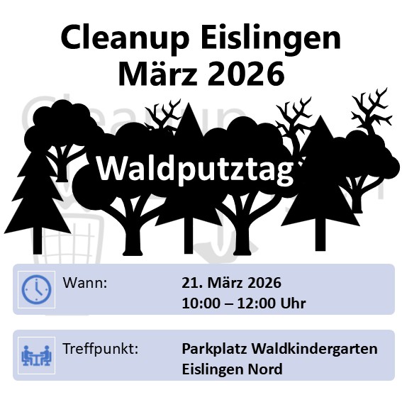 Unser monatliches Cleanup in Eislingen findet am 21. März 2026 am Waldputztag statt. Treffpunkt ist am Parkplatz Waldkindergarten „Ameisenstraße“ / Gartenfreunde Eislingen.